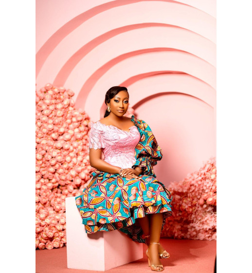 A stunning fusion of soft pink lace and vibrant African print, with ruffled layers and a single puff sleeve that commands attention. Designed to celebrate feminine grace and modern tradition.