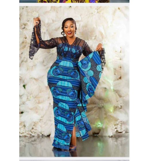A bold fusion of blue Ankara and lace, designed to flatter, empower, and command attention.