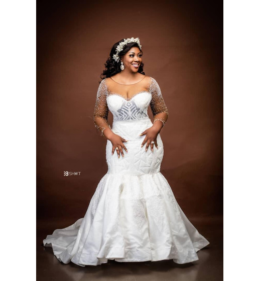 Grace meets grandeur in this ivory mermaid bridal gown, adorned with hand-beaded sheer sleeves and geometric embroidery.