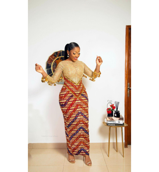 This full-length gown pairs intricate gold embroidery with bold kente prints, celebrating tradition with a touch of red-carpet glamour. Designed to cinch the waist and command attention with every step.